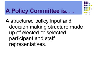 The document discusses establishing an effective policy committee for a youth program. It lists examples of policy committee responsibilities such as recommending policy changes, selecting community service projects, and reviewing budgets. It also discusses different levels of decision-making a policy committee can have, from simply providing input to making collective decisions. Finally, it outlines key practices for establishing an effective policy committee, including ensuring structural and operational respect, and focusing on relationship development between committee members and staff.
