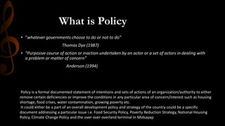 This document outlines the eight stages of policy formulation: 1) identifying the problem, 2) reviewing existing policies, 3) developing alternative solutions, 4) setting goals, 5) building public support, 6) legislating or announcing the policy, 7) implementing the policy, and 8) evaluating the policy. It defines policy as a formal statement by an organization to address issues like poverty or the environment. The stages involve thoroughly understanding the problem, exploring options, gaining support, enacting and enforcing the policy, and assessing its effectiveness.