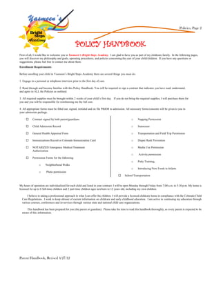 This document outlines policies for a childcare center called Yasmeen's Bright Steps Academy. It discusses enrollment requirements, rates and fees, operating procedures around arrival/departure and vacations/holidays. Key policies include: