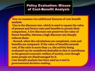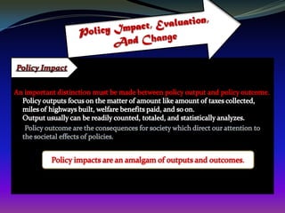 The document discusses the final stage of the policy process, which is the evaluation of policy to assess its content, implementation, and effects throughout the process using various methods like systematic evaluation; however, policy evaluation faces challenges like uncertainty over goals and difficulty determining causality due to diffuse impacts. Proper policy evaluation is important to provide an understanding of a policy's actual impact and inform decision-making.