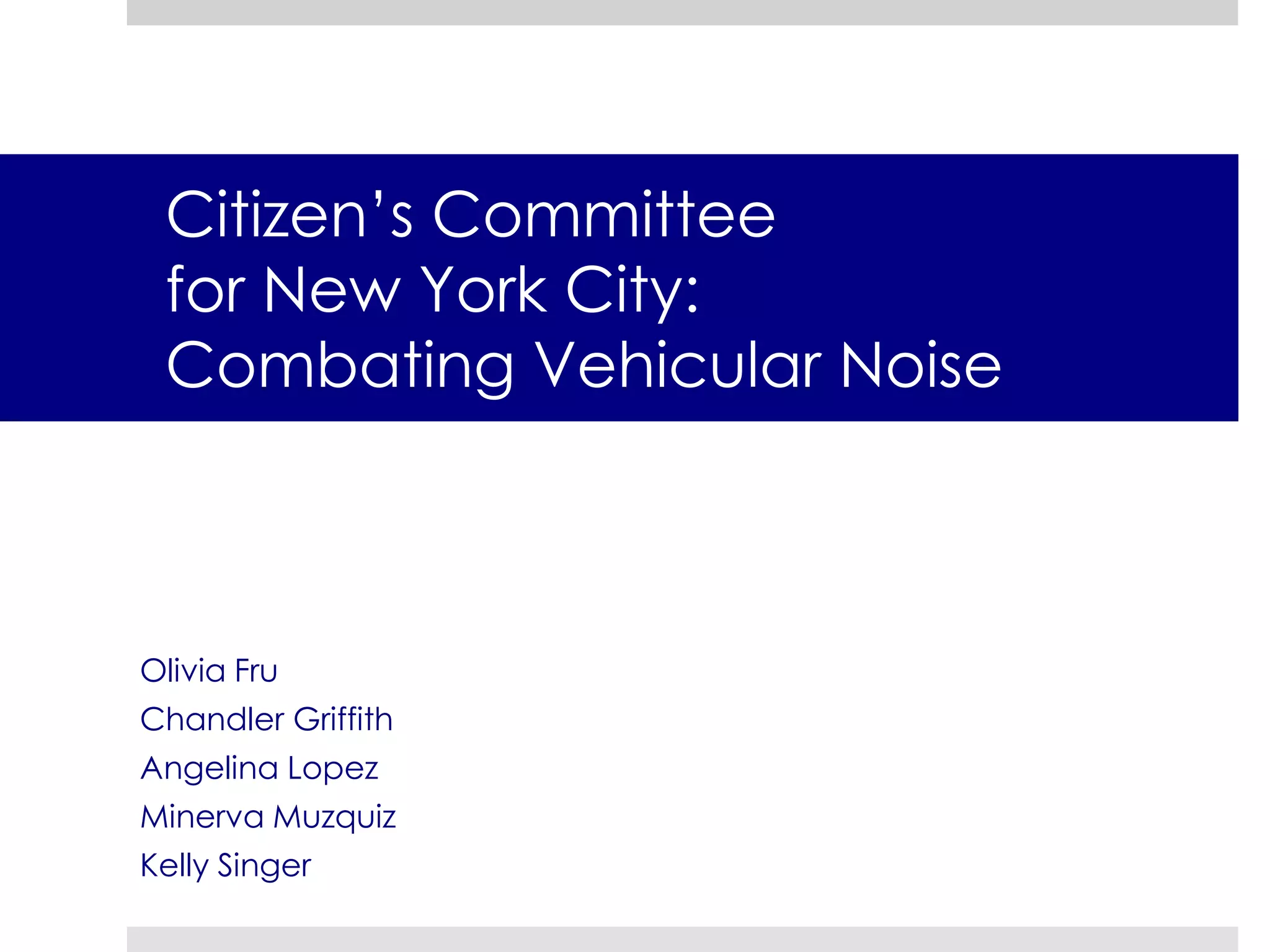 The Citizens Committee for New York City aims to enhance community efforts to combat vehicular noise pollution through various strategies. Key recommendations include creating a social networking website for residents to engage, document noise issues, and organize community actions. The document outlines the importance of public awareness campaigns, workshops, and technology to foster collective action against noise pollution.