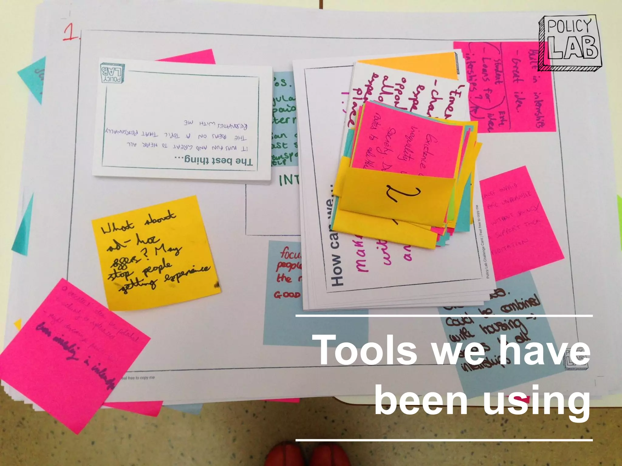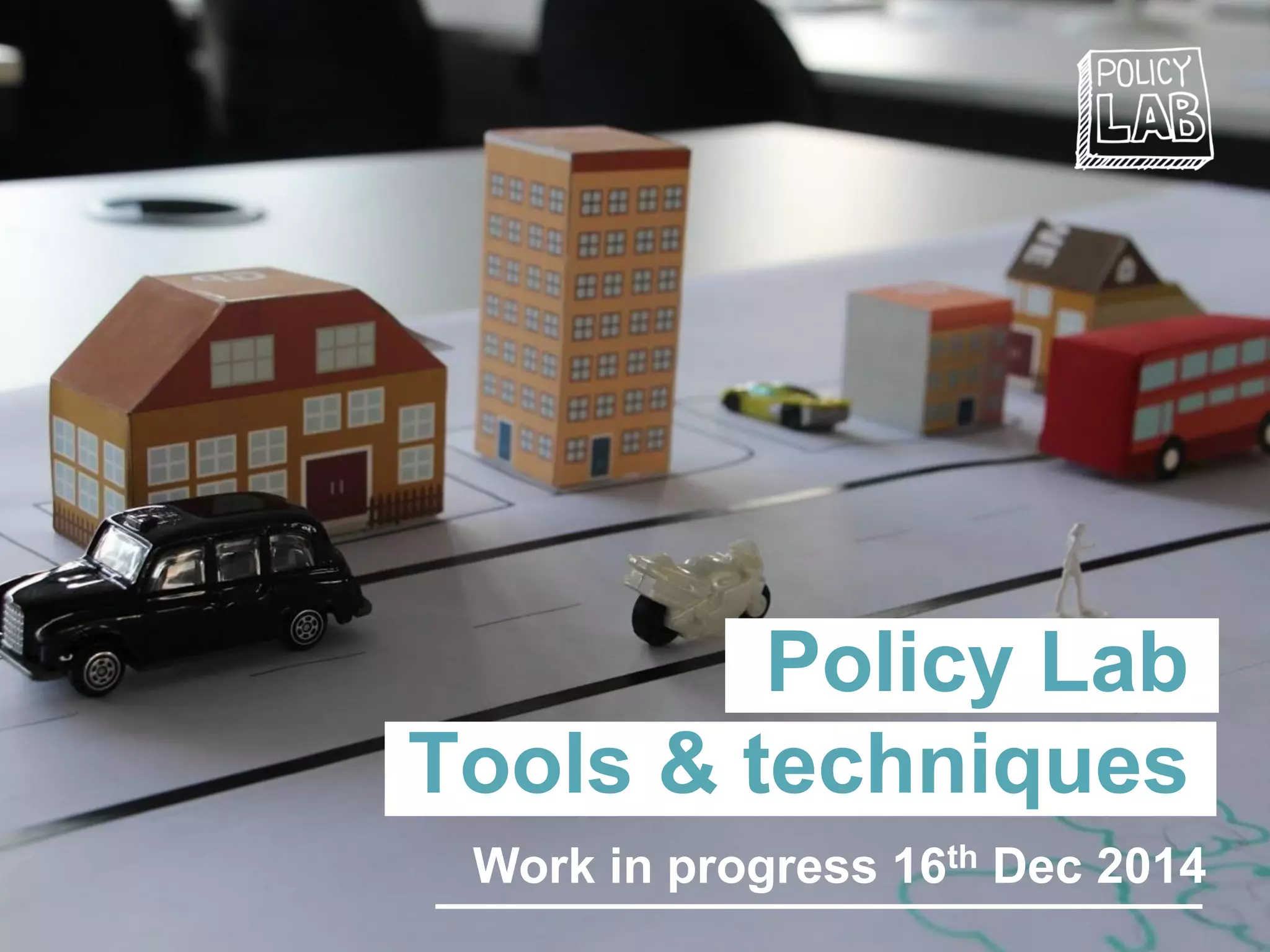 The document outlines various tools and techniques utilized by the Policy Lab for collaborative policy development and design thinking, including workshops, user journey mapping, and prototyping. It highlights the role of the Policy Lab within government, details specific demonstration projects, and lists partnerships with design industry experts and advisory groups. The Policy Lab aims to create shared ownership, improve user experiences, and generate innovative policy ideas through collaborative efforts.