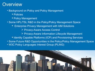 The document discusses policies and policy management. It defines a policy as a set of rules that guide decisions and actions. Policy management involves defining, enforcing, and monitoring compliance with policies. The document also describes Hewlett-Packard's research in policy management solutions for enterprise privacy, identity management, and information lifecycle management.