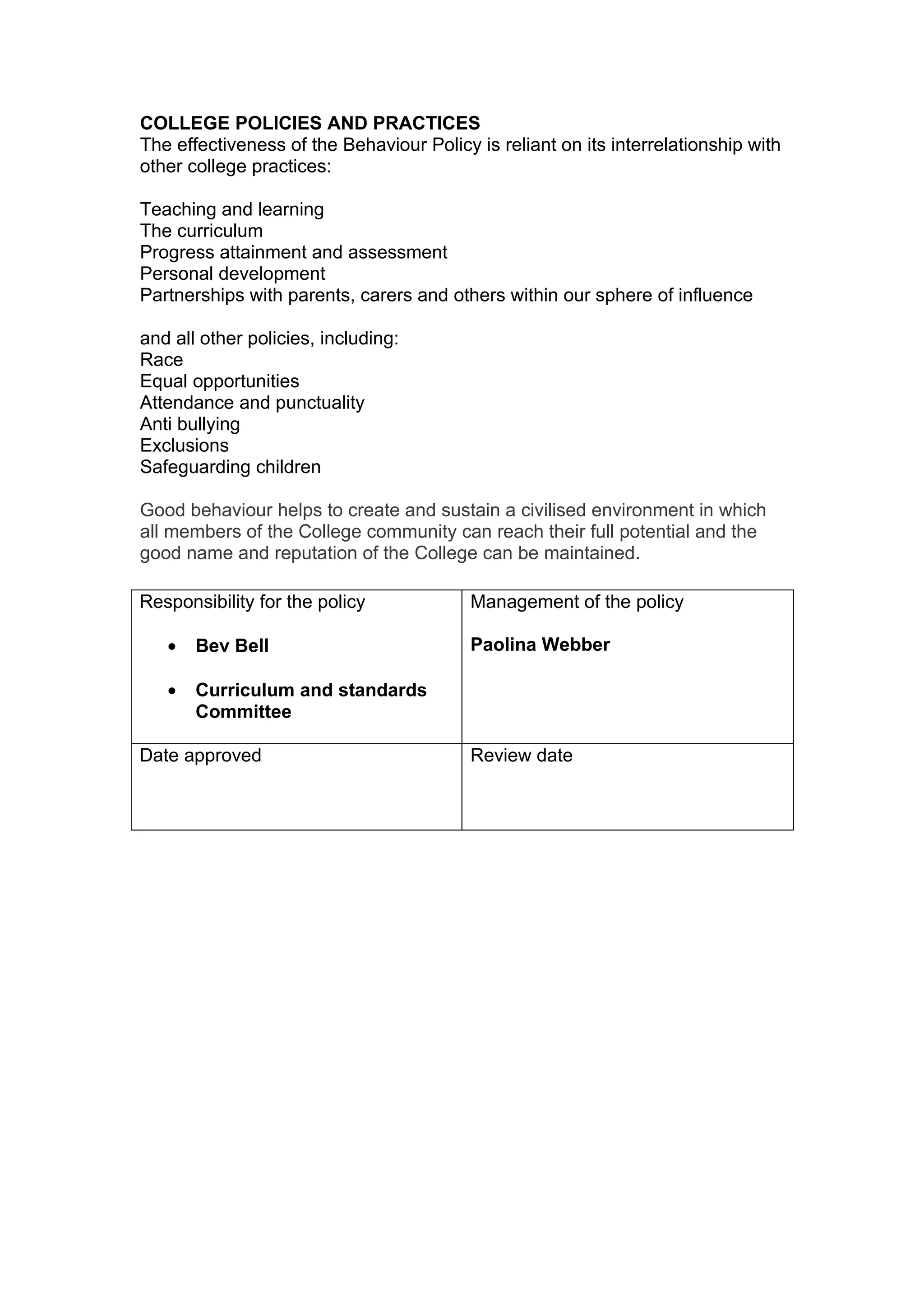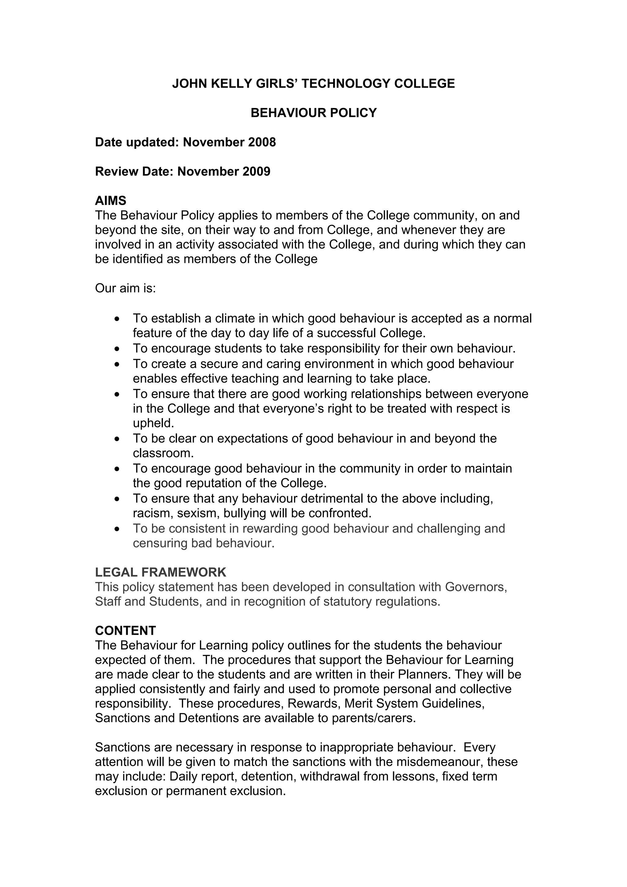 This document outlines the behavior policy of John Kelly Girls' Technology College. It aims to establish a climate of good behavior by encouraging student responsibility and creating a secure learning environment. The policy is applied consistently to uphold all students' right to respect. Inappropriate behaviors are addressed through sanctions proportional to the misdeed, such as detention or exclusion. The policy works with other college practices and policies to help students reach their potential and maintain the college's reputation.