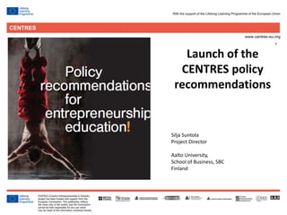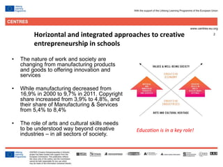 The document discusses recommendations for incorporating creative entrepreneurship education across school curriculums in a more horizontal and integrated way. It recommends that art subjects and art-based skills be increased in curriculums and incorporated across disciplines. It also recommends building teacher competency for including art-based methods horizontally. Formal and informal creative entrepreneurship programs should become compulsory, and link education institutions more closely with businesses through programs like incubators and talent development projects. Digital technologies also offer potential for releasing creative ideas through digitally-enabled entrepreneurship programs combining technology and creativity.