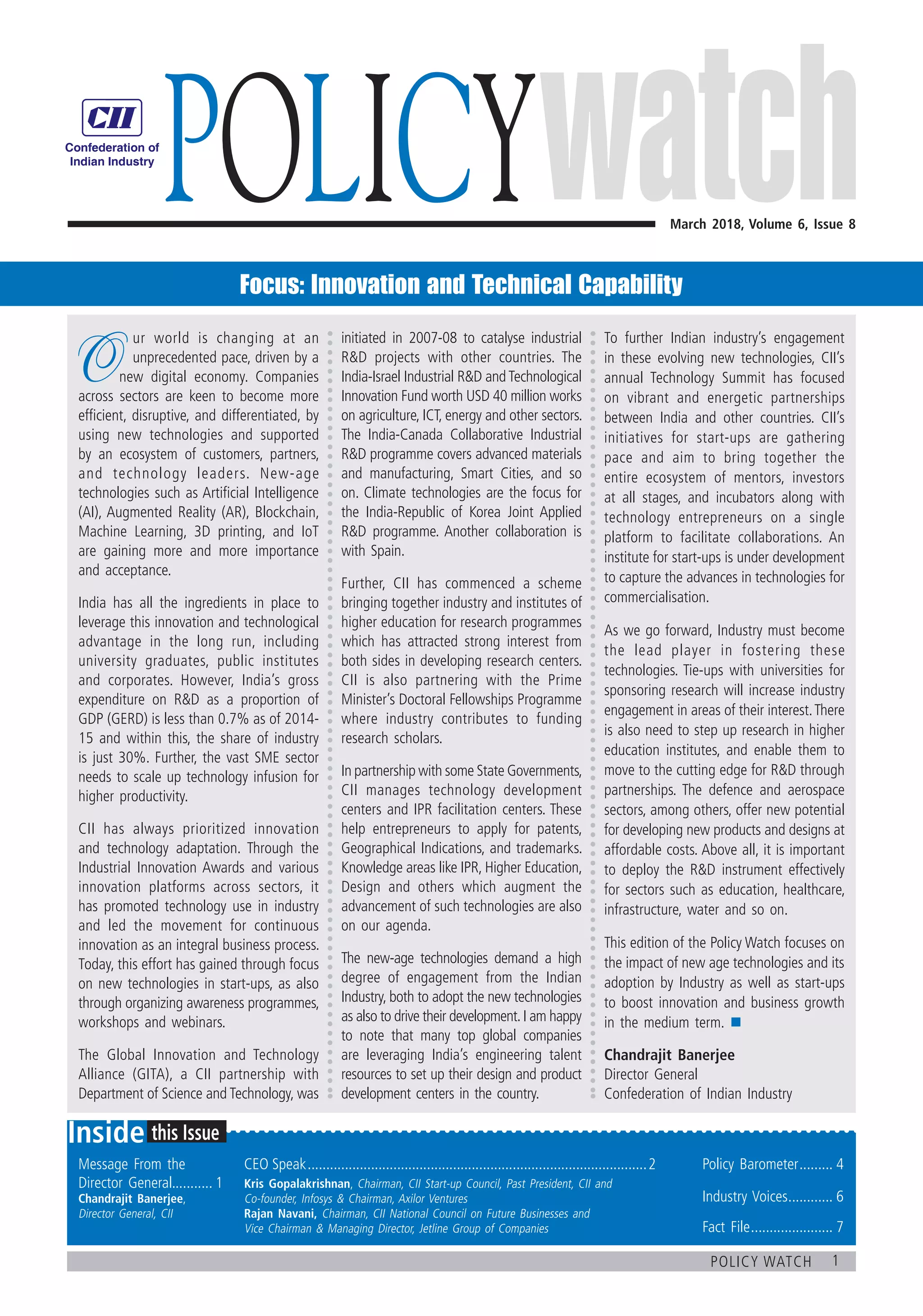 2) CII has been promoting technology adoption in Indian industry through various programs and platforms. It is also partnering with the government on initiatives to facilitate industry-academia collaboration and international joint R&D projects.