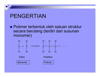 Dokumen ini membahas pengertian dan klasifikasi polimer, termasuk termosett, termoplastik, plastomer, elastomer, dan duromer, serta aplikasi dan sifat masing-masing jenis. Penjelasan tentang bahan tambahan seperti plastiser dan pewarna juga disertakan, yang penting untuk meningkatkan mekanis dan daya tahan produk plastik. Selain itu, dibahas pula proses pengolahan plastik seperti cetak suntik, ekstrudasi, dan cetak tiup.