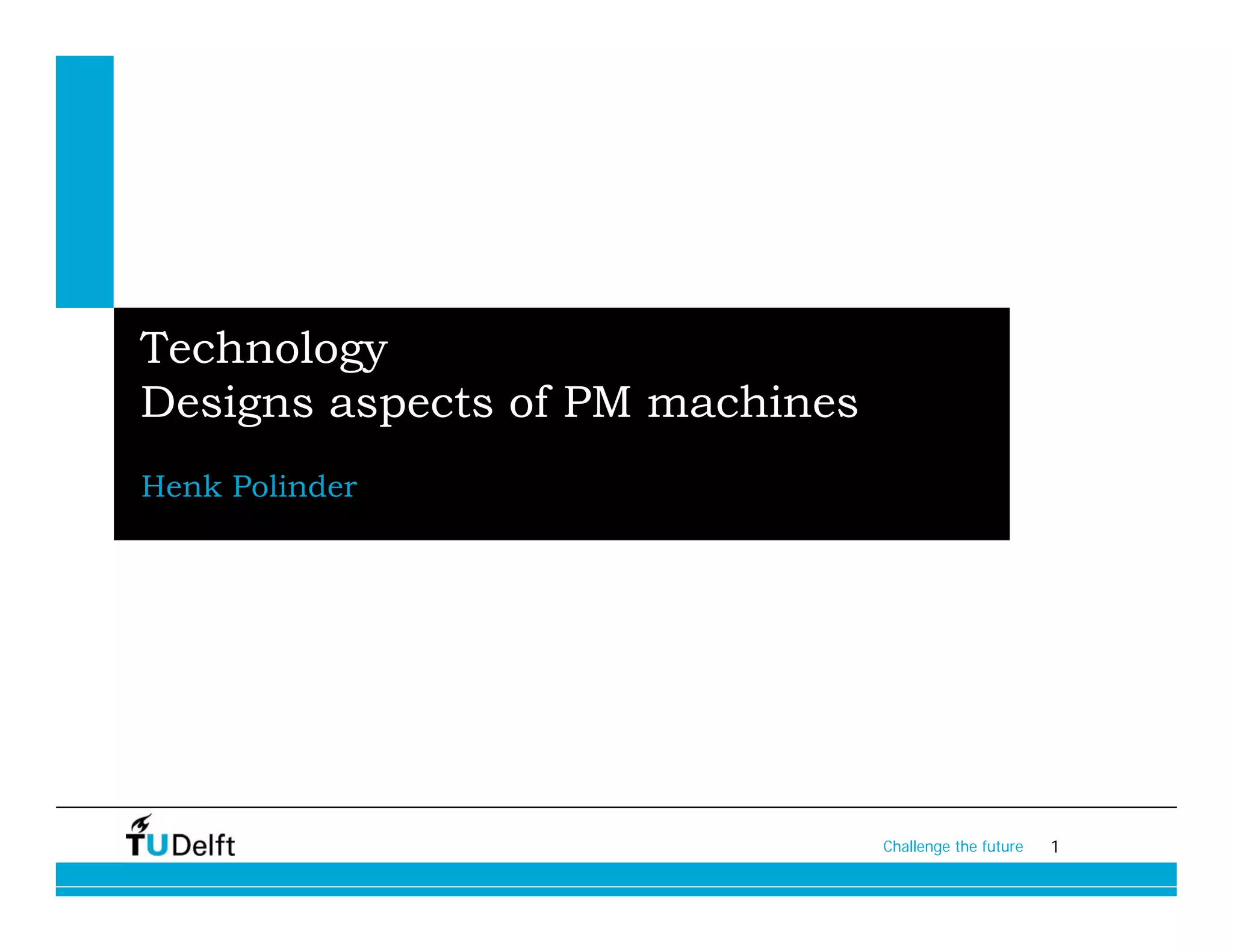 This document discusses permanent magnet machines. It begins by defining permanent magnets and their properties. It then covers classifications of permanent magnet machines and differences compared to other machine types. Calculation methods like analytical and finite element modeling are also discussed. Key issues addressed include demagnetization risks, material availability and costs. The document concludes permanent magnet machines provide benefits of high efficiency and power density but also challenges around demagnetization and material sourcing.