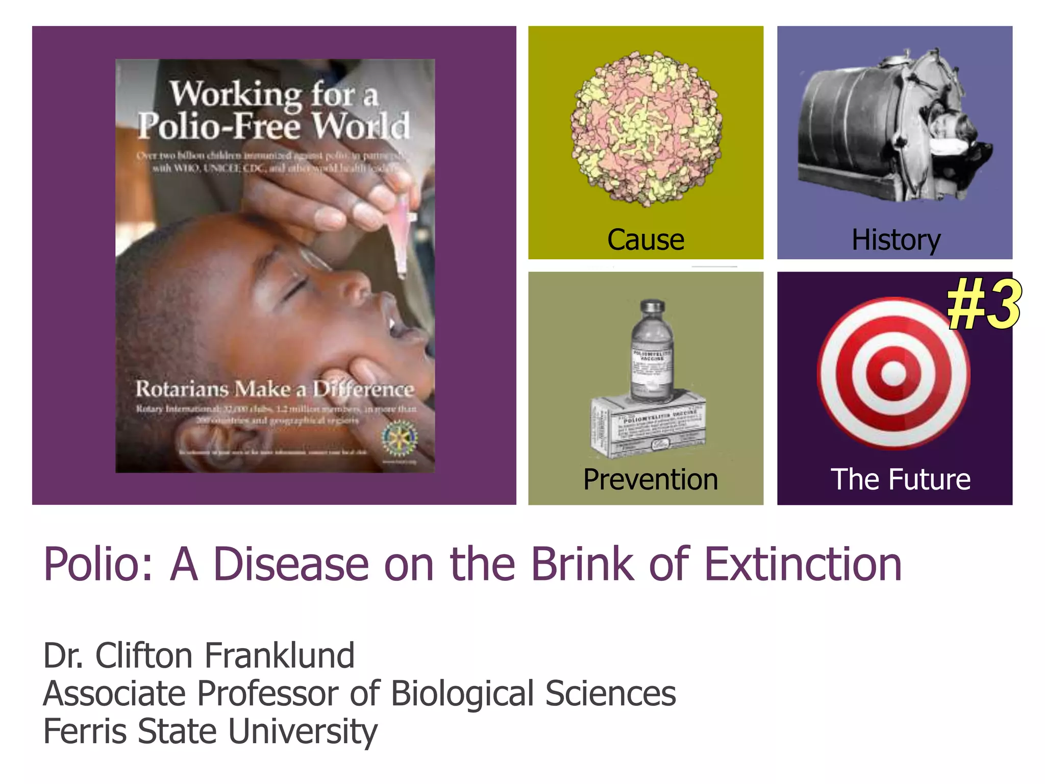 The document summarizes the history and current status of polio. It describes how polio is caused by a picornavirus that infects the gastrointestinal tract and sometimes the central nervous system, causing paralysis. The disease was common worldwide until vaccines were developed in the 1950s. Jonas Salk developed the first inactivated polio vaccine in 1953, and Albert Sabin developed an oral attenuated vaccine in 1956. Widespread vaccination campaigns in the US and globally in subsequent decades led to a dramatic reduction in polio cases. While polio has been eradicated in most countries, it remains endemic in only a few developing nations in Asia and Africa. Global health organizations aim to completely eradicate the disease worldwide.
