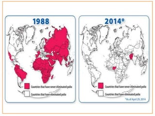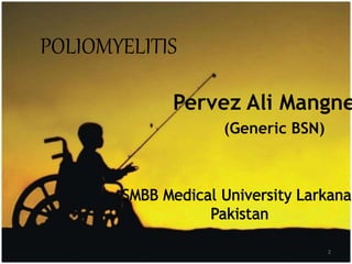 This document provides information about poliomyelitis (polio). It begins by defining the objectives of the document, which are to define polio, explore its history and pathogenesis, describe the types and clinical manifestations, discuss management, and explain the nurse's role in prevention. It then provides key facts about polio, statistics on outcomes of paralysis, highlights from the history of polio research, global eradication efforts and statistics on cases in Pakistan. The document discusses the virus, pathogenesis, clinical manifestations including paralysis, management including rest and ventilation, and the nurse's role in vaccination and education.