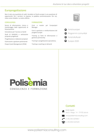 Il documento descrive i servizi offerti da un'agenzia di comunicazione, incentrati sulla consulenza e formazione in vari ambiti, tra cui comunicazione istituzionale, marketing, gestione delle politiche pubbliche e progetti europei. L'agenzia si propone di migliorare la comunicazione e sviluppare competenze nei settori della sicurezza, ambiente ed energie rinnovabili. Inoltre, enfatizza l'importanza della comunicazione come strategia per generare valore e consenso.