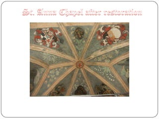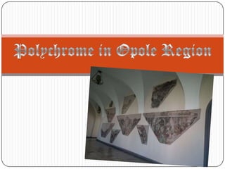 Polychrome is the use of multiple colors in architecture, sculpture, or other art forms. The term comes from Greek words meaning "many colors." Most often it refers to Gothic, Art Nouveau, or Renaissance styles that use varied colors. Examples can be found in churches around Poland, including the Franciscan Church in Opole which contains well-preserved 16th century polychrome paintings and fragments in its chapels and on walls. The Brzeg Polychrome Route also features several medieval churches with rediscovered Gothic-era polychrome artworks.