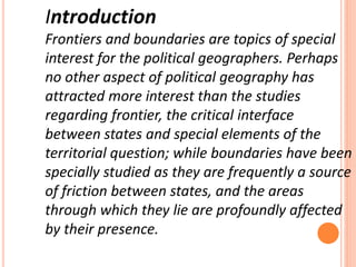 This document discusses frontiers and provides classifications of different types of frontiers. It defines a frontier as a politico-geographical area at the margin of a political unit's territory where expansion can occur. Frontiers are classified based on their relationship to a state's sovereignty, indigenous populations, pace of expansion, and degree of trans-frontier contact. Examples include political frontiers which mark the limits of de facto state control, and settlement frontiers which indicate stages of state expansion into new lands. Frontiers can involve inclusion or exclusion of indigenous groups and can be dynamic with continuous expansion or static if expansion is halted. The document also distinguishes between frontiers and boundaries, noting that frontiers are outward-oriented zones while boundaries are