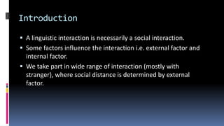 This document discusses politeness and interaction in pragmatics. It explains that linguistic interactions are social interactions influenced by external and internal factors. Politeness can be defined as means to show awareness of another's public self-image or "face." Face-threatening acts risk damaging someone's self-image while face-saving acts aim to maintain it. Positive face relates to inclusion while negative face relates to independence. Speakers can make implied or direct requests on or off the record. Pre-sequences are used before requests, invitations, and announcements to assess receptiveness.