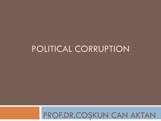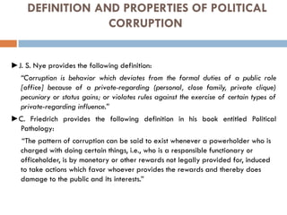 The document defines and discusses various types of political corruption. It begins by providing definitions of political corruption from two scholars. It then outlines basic characteristics, such as it appearing in political processes and relationships between political actors. Several types of political corruption are detailed, including bribery, extortion, embezzlement, favoritism (nepotism, cronyism, political favoritism), patronage, pork-barreling, lobbying, rent seeking, leakage of public secrets, and political manipulation. The document provides examples and explanations for each type.