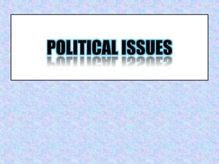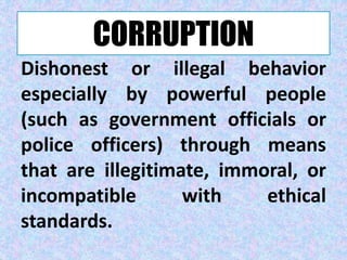 This document discusses various types of political corruption that occur in the Philippines, such as tax evasion by politicians and "ghost projects" financed by the government. It also examines positive and negative effects of laws and systems like political dynasties. Political dynasties concentrate political and economic power within families, making it difficult for newcomers to enter politics, and family members are sometimes elected due to their connections rather than qualifications. Overall, corruption undermines economic growth and hurts the poor.