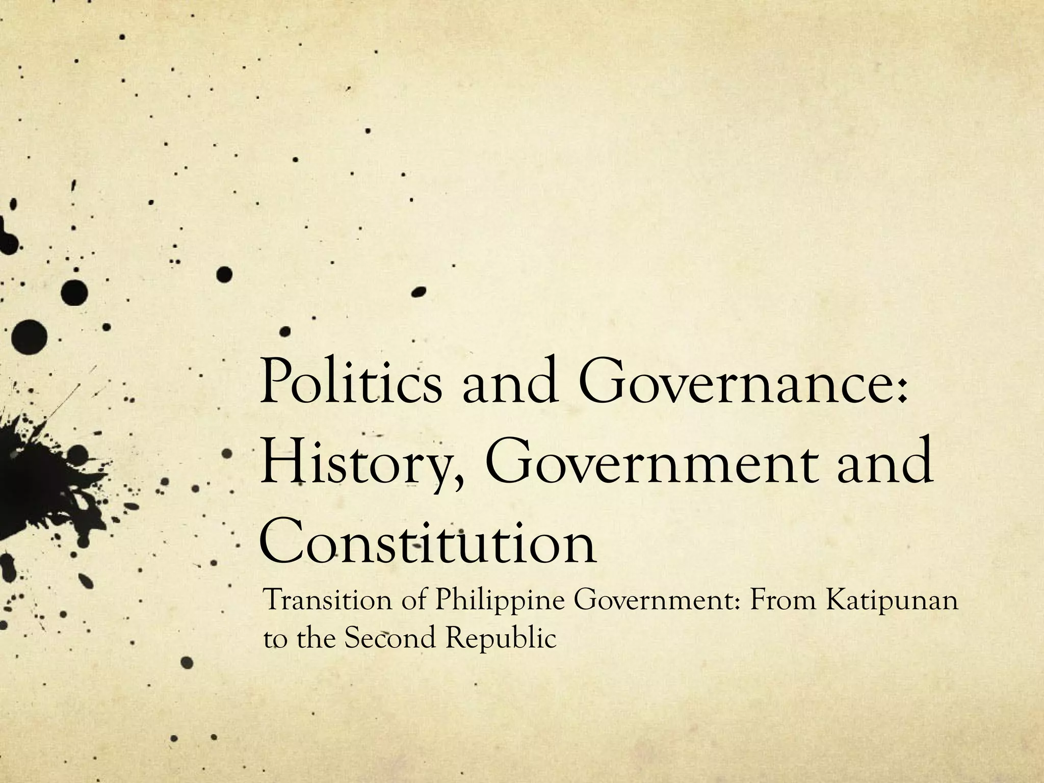 The document summarizes the transition of Philippine government from the revolutionary Katipunan movement to the establishment of the Third Republic. It discusses the various revolutionary governments established including the Biak-na-Bato Republic, Revolutionary Government, Malolos Congress, and Constitutional Government. It also outlines the American colonial period and governments, Japanese occupation, Second Republic under Laurel, and concludes with an overview of the six presidents of the Third Republic from 1946 to 1986.