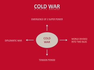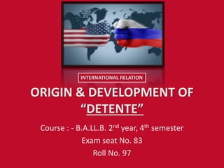 This document discusses the origins and development of detente during the Cold War between the US and USSR. It outlines the phases of the Cold War from 1946-1976. Detente emerged during the third phase from 1953-1957 as tensions grew but the two superpowers also engaged in some negotiations. The fourth phase from 1957-1962 saw some peaceful exchanges but also the Cuban Missile Crisis. The fifth phase led to a nuclear test ban treaty in 1963 but disputes remained. The sixth phase created a more suitable climate for detente, culminating in arms limitation treaties in 1972-1973 as cooperation increased between the US and USSR.