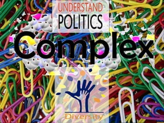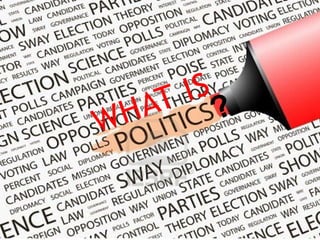 This document provides an overview of key concepts in politics and political science. It defines politics as the art and science of government that involves making common decisions for groups of people. It discusses political concepts like power, authority, legitimacy, attitudes, public opinion, perception, values, conflict, and decision-making. It also examines governance, political processes, institutions, groups, and individuals. Overall, the document presents foundational information about many important elements of politics.