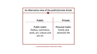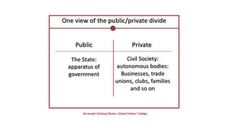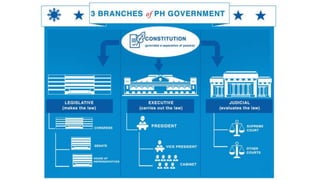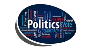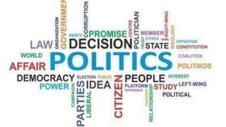The document explores various concepts of politics, including its definitions related to governance, public affairs, conflict resolution, and resource distribution. It outlines essential political principles such as consent of the governed, rule of law, and democracy, emphasizing equality, diversity, and justice in a free society. The document also describes the structure of the Philippine government, detailing the roles of the legislative, executive, and judicial branches within a presidential system, including checks and balances and the process of law-making.