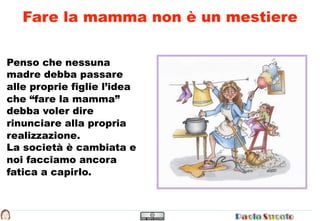 Il documento discute il ruolo della madre nella società italiana, sostenendo che non dovrebbe comportare una rinuncia alla realizzazione personale. Viene evidenziato come le aspettative nei confronti delle madri siano cambiate, ma che la società continua a giudicare le donne che non si dedicano completamente alla maternità. Si invita a cercare pari responsabilità e opportunità per i genitori, esortando a chiedere supporto da parte delle aziende e della comunità.