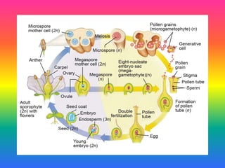 The document outlines key concepts related to pollination and fertilization in flowering plants, including definitions of pollination, types of pollination, and agents that facilitate it. It explains the process of fertilization and the significance of double fertilization, detailing how male and female gametes combine to form seeds and the role of the endosperm. Diagrams are included to illustrate the processes from pollination to fertilization and the structure of flowering plants.