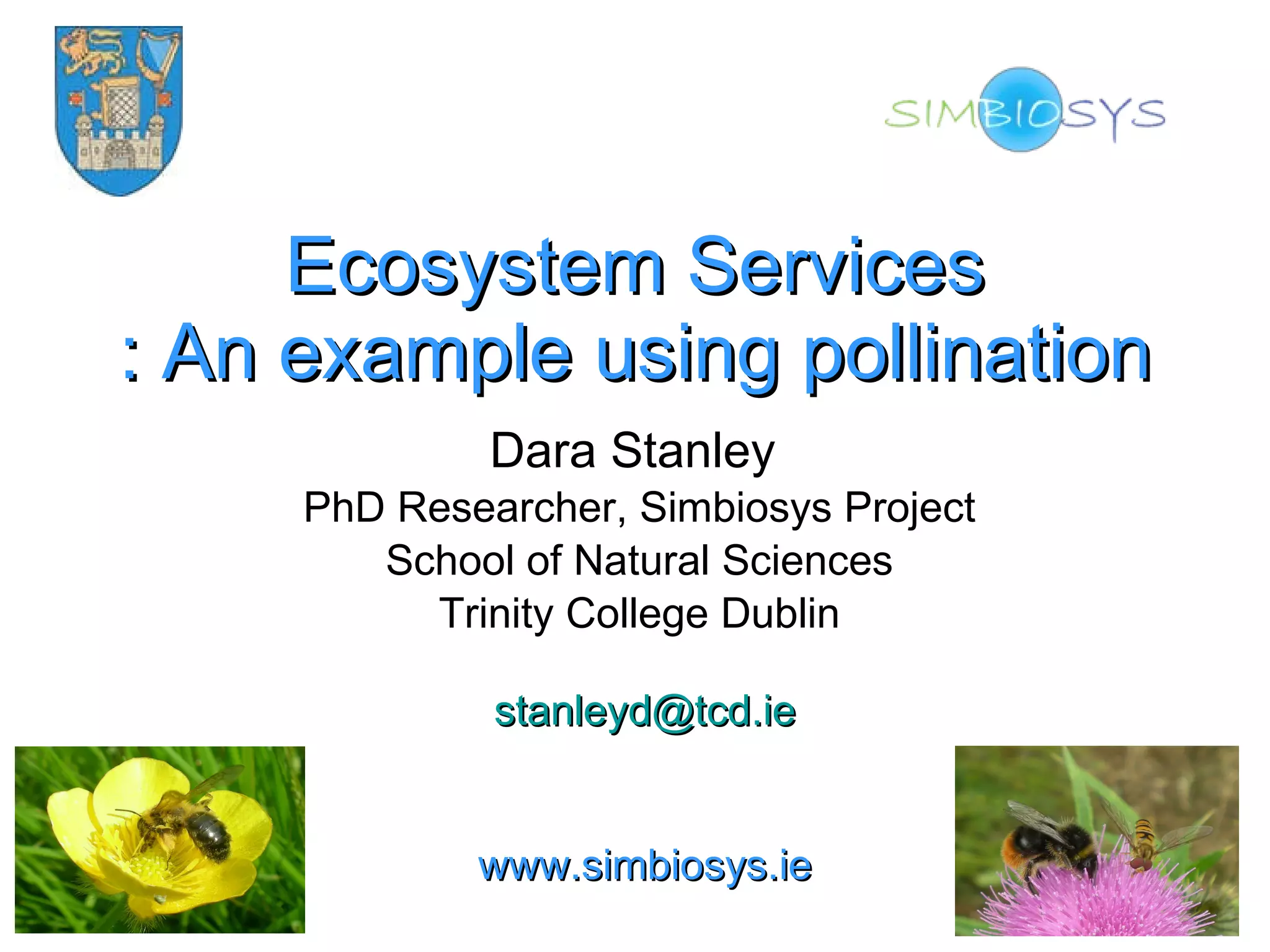 This document discusses ecosystem services and pollination as an example. It defines biodiversity and ecosystem services, which include supporting, regulating, provisioning, and cultural services that benefit human well-being. Pollination is highlighted as an important regulating service, with 85% of flowering plants relying on pollinators. The value of pollination in Ireland is estimated at €53-500 million annually. However, pollinator populations are in decline due to threats like habitat loss and pesticide use. Increased awareness and understanding of ecosystem services, including their economic value, can help conservation efforts.