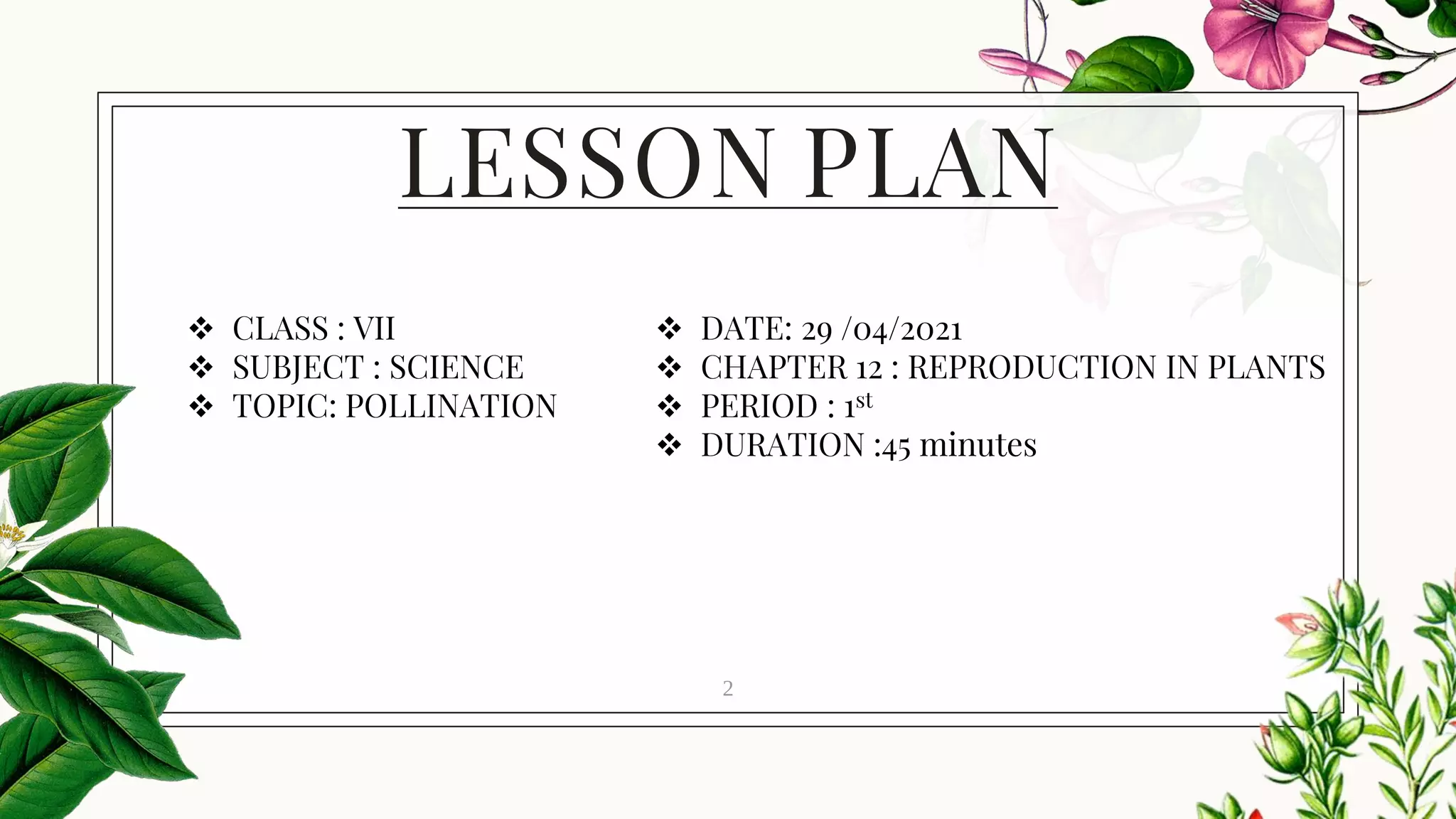 This lesson plan is for a 7th grade science class on pollination. The lesson will last 45 minutes and cover key terms related to pollination like anther, filament, stigma, and pollen. Students will simulate the process of pollination using materials to represent flower parts. They will observe the transfer of simulated pollen between cotton balls. The teacher will then explain how this relates to the real process of pollination between flowers. Students will learn about self-pollination and cross-pollination, as well as different pollination agents like wind, water, insects and birds. The lesson aims to help students understand the importance of pollination for plant reproduction.