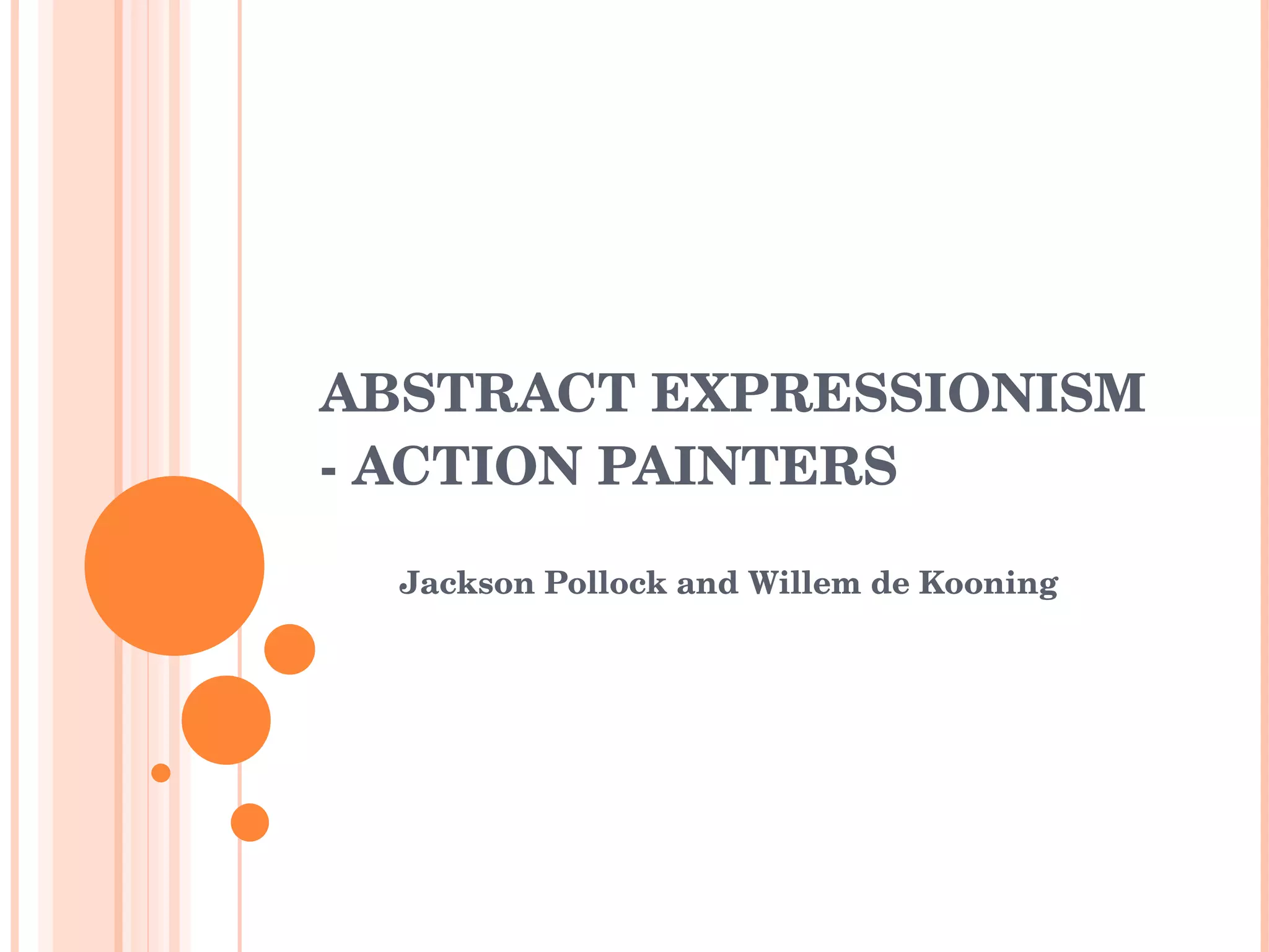 The document provides information about abstract expressionist artists Jackson Pollock and Willem de Kooning. It discusses Pollock's development of his signature "drip and splash" technique in the late 1940s. It also examines de Kooning's gestural style and his controversial "Woman" series from the early 1950s that confronted stereotypes of female representation. The document analyzes key works from both artists' careers through the lens of their experimental techniques and subject matters.