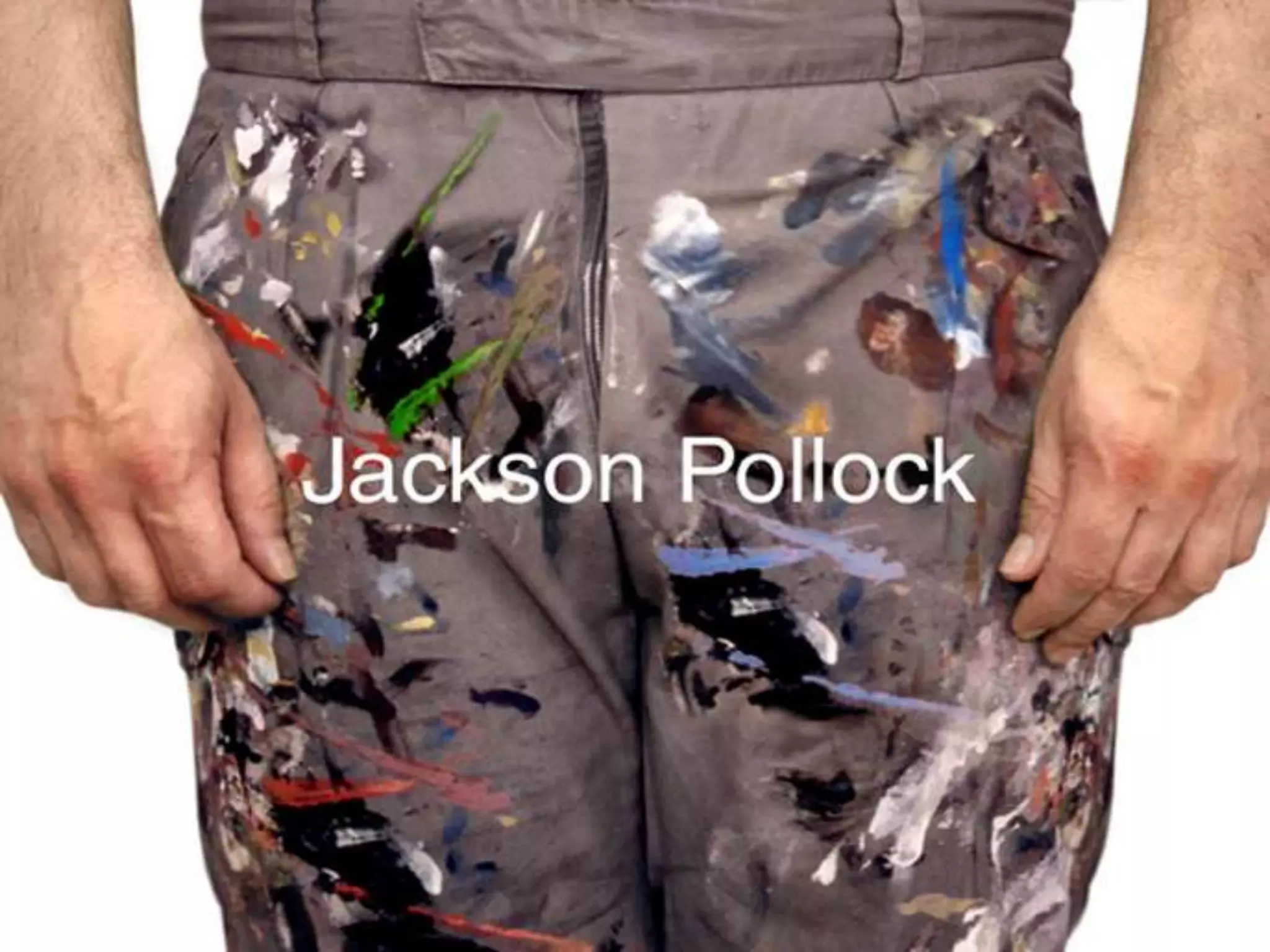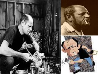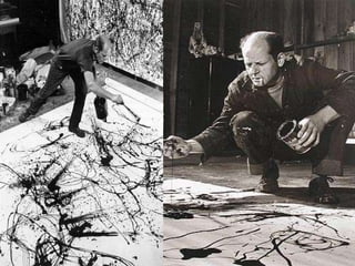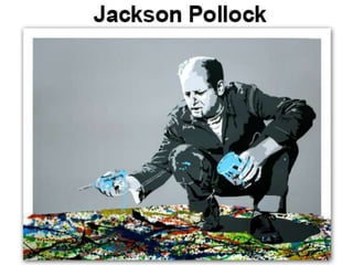 The document lists key details about the life and work of American artist Jackson Pollock including some of his major paintings from 1938 to 1953 such as "Hacia el Oeste" and "Number 32", as well as photos of him with other artists from the New York School. It also mentions Pollock's relationship with Peggy Guggenheim who supported his work and a famous quote of his about expressing feelings rather than illustrating them.