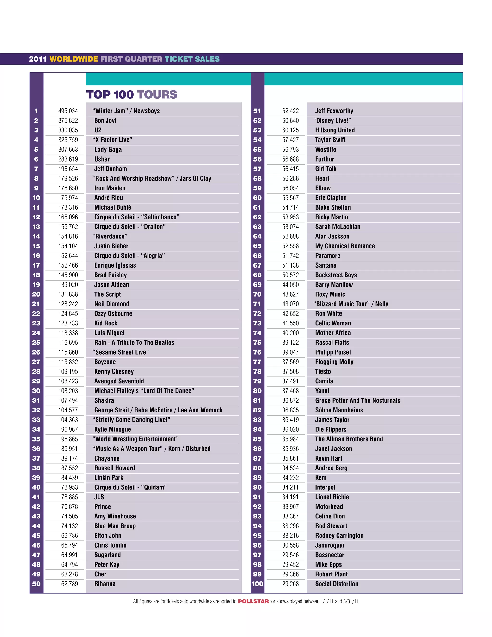 The document summarizes worldwide first quarter ticket sales data for 2011. It lists the top 100 tours by ticket sales, led by "Winter Jam" with nearly 500,000 tickets sold. It also lists the top 50 promoters by ticket sales, led by Live Nation and AEG Live who together sold over 3.8 million tickets. All figures reported are for tickets sold between January 1 and March 31, 2011.