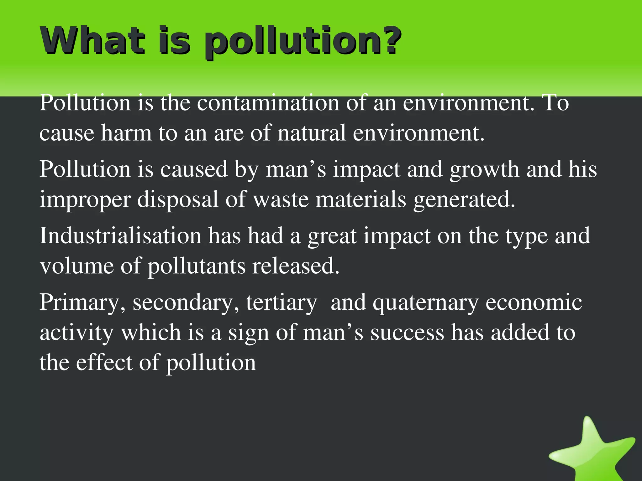 This document defines and discusses different types of pollution: land/soil pollution, water pollution, and air pollution. Land pollution results from improper disposal of waste and use of chemicals in agriculture and industry. Water pollution occurs when contaminants from sources like factories, oil spills, and untreated waste enter bodies of water. Air pollution is caused by emissions from vehicles, power plants, manufacturing, and other human activities that release smog, acid rain, and other particulate matter into the atmosphere. The growth of industry and modern economic activity has contributed greatly to increased pollution levels across land, water, and air.