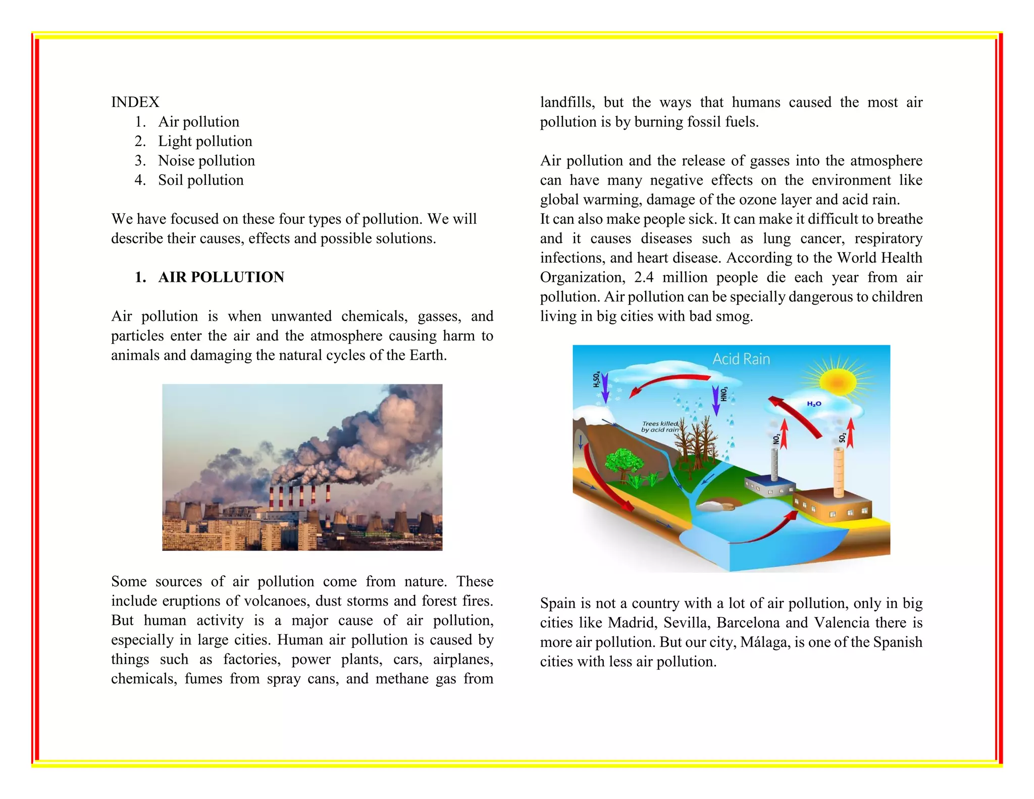This document discusses four main types of pollution: air, light, noise, and soil pollution. It provides details on the causes and effects of each type as well as possible solutions. For air pollution, it notes that human activities like burning fossil fuels are major causes and details health impacts. For light pollution, it explains how excess or poorly directed light can impact ecosystems and waste energy. Noise pollution effects like hearing loss and its prevalence in Spain are outlined. Finally, it describes how soil pollution occurs from improper waste disposal and chemicals and its health and environmental risks.