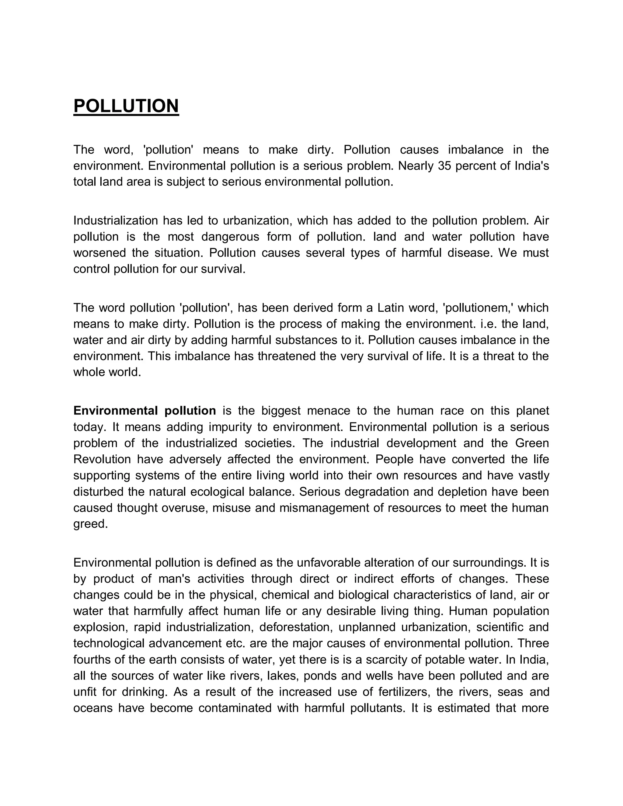 The document discusses various types of pollution including air, water, land, noise, and radioactive pollution. It provides details on the causes and impacts of each type. The main causes of pollution are industrialization, urbanization, population growth, and improper waste disposal. Pollution poses serious threats and has caused diseases, environmental imbalances, and harm to human health and survival. Urgent action is needed to control pollution and protect the environment.