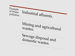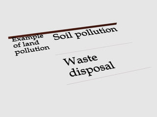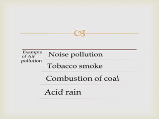 Pollution is the addition of substances to the ecosystem that have detrimental effects. The document discusses four main types of pollution: air, water, land, and noise. Air pollution involves accumulation of substances in the atmosphere that endanger health or living organisms. Water pollution is the introduction of chemicals, physical materials, or biology into fresh or ocean water that degrades quality and harms organisms. Land pollution is degradation through misuse of soil from poor agriculture, mining, dumping waste, and improper urban waste disposal.