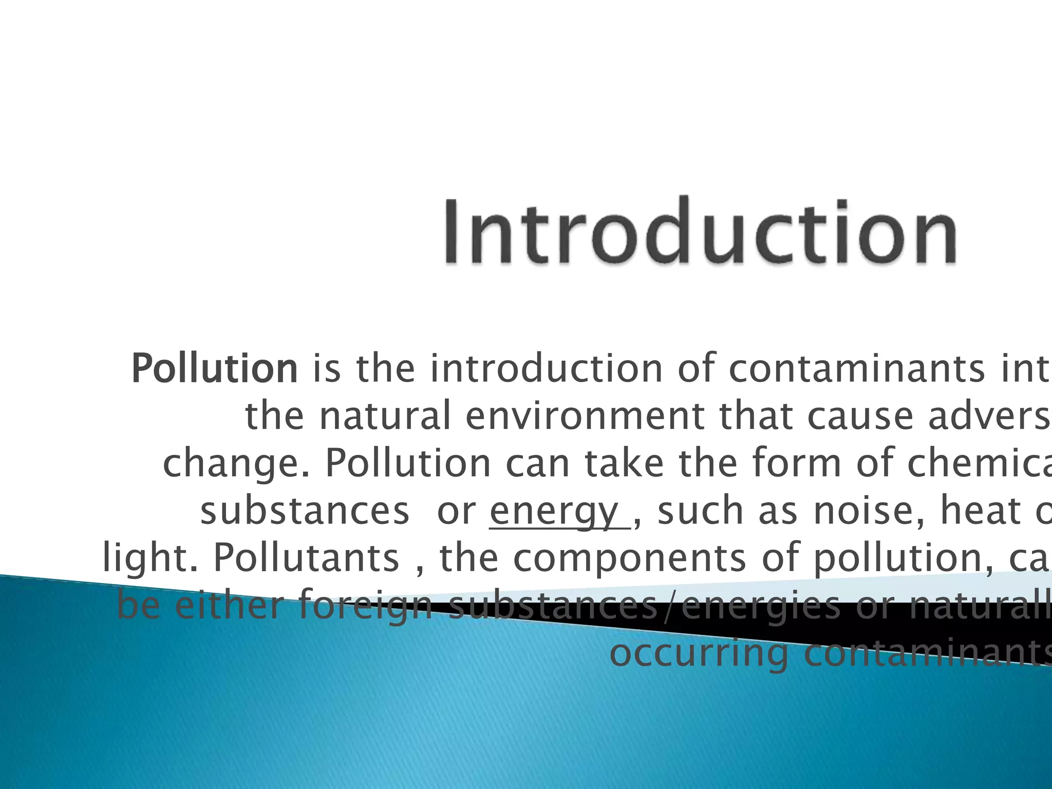 Pollution is the introduction of contaminants into the natural environment that cause adverse changes. There are several types of pollution discussed in the document, including air, noise, soil, water, light and litter pollution. Air pollution involves direct release of chemicals into the environment. Noise pollution is an increase in unpleasant sounds that adversely affect humans. Soil pollution contaminates soil by releasing harmful substances. Water pollution affects aquatic life and humans rely on water. Various types of pollution can cause human health issues like respiratory diseases and hearing loss. Pollution control aims to manage emissions and effluents through practices like recycling, reusing, and waste minimization.