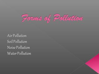 The document discusses different types of pollution including air, water, soil, noise pollution and their causes and effects. It notes that pollution causes environmental degradation, human health issues and global warming. Some key effects are acid rain, damage to wildlife from oil spills, respiratory and heart diseases from air pollution, and hearing loss from noise pollution. The document also briefly describes pollution control techniques to manage emissions and effluents.