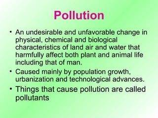 The document discusses different types of environmental pollution including atmospheric, water, soil, radioactive, and noise pollution. It outlines various causes and sources of pollution such as population growth, urbanization, industrial activities, and transportation. Some key effects of pollution mentioned are harm to human health, damage to ecosystems, and deterioration of materials. The document also proposes measures to control different types of pollution like using cleaner energy sources, reducing pollutant emissions, enacting laws, and increasing green cover.