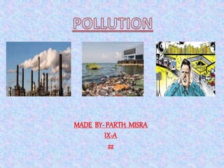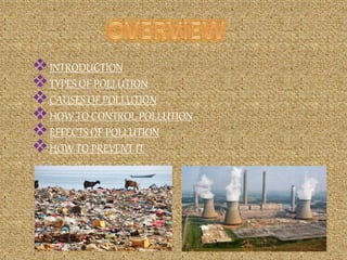 The document discusses three main types of pollution: air, water, and noise. It provides details on the causes and sources of each type of pollution, health and environmental effects, and ways to control and prevent pollution. Air pollution is caused mainly by industries, automobiles, and domestic fuels and affects human health, animals, plants, and the atmosphere. Water pollution results from industrial and sewage waste contaminating rivers and can cause diseases. Noise pollution stems from traffic, construction, industries, and loud speakers, and has health impacts like hearing loss and stress. The document recommends alternatives like using cleaner fuels, harvesting rainwater, and implementing noise control technology.