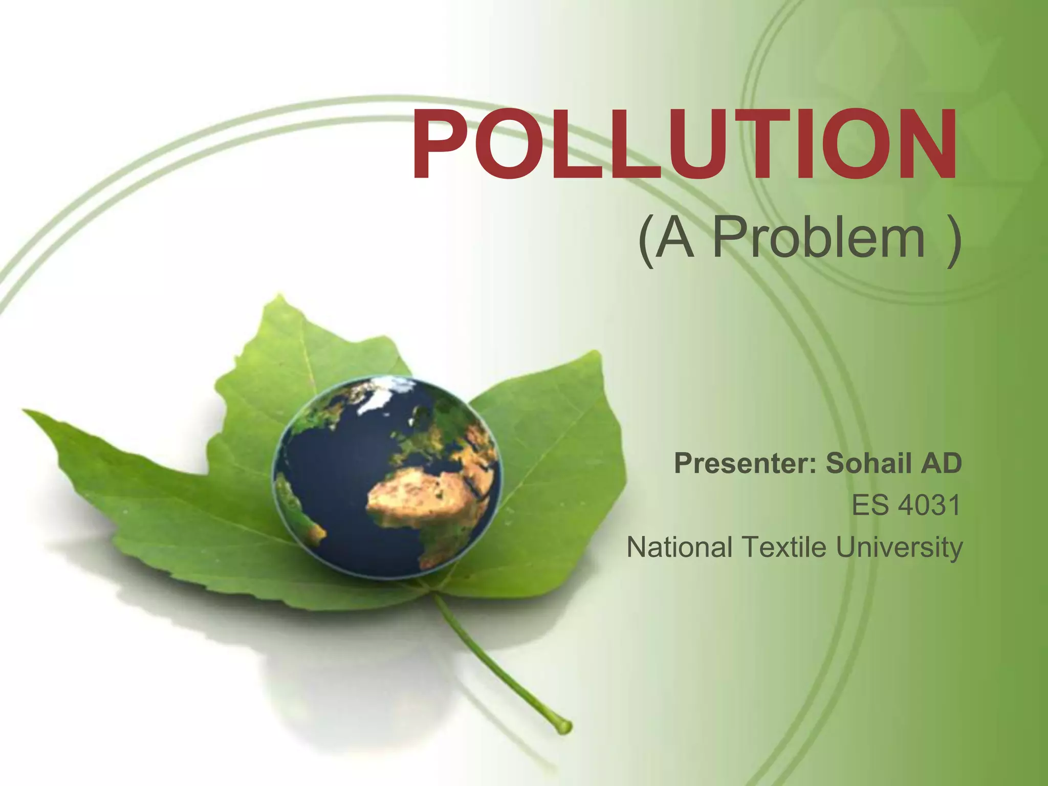 Pollution is the introduction of contaminants into the natural environment that causes harm. It comes in many forms including air, water, soil, noise, light and plastic pollution. Major causes are industry, vehicle emissions, and improper waste disposal. Effects include damage to ecosystems, health problems and reduced quality of life. Solutions require reducing pollution at the source, proper waste treatment, using renewable resources, and developing clean technologies.