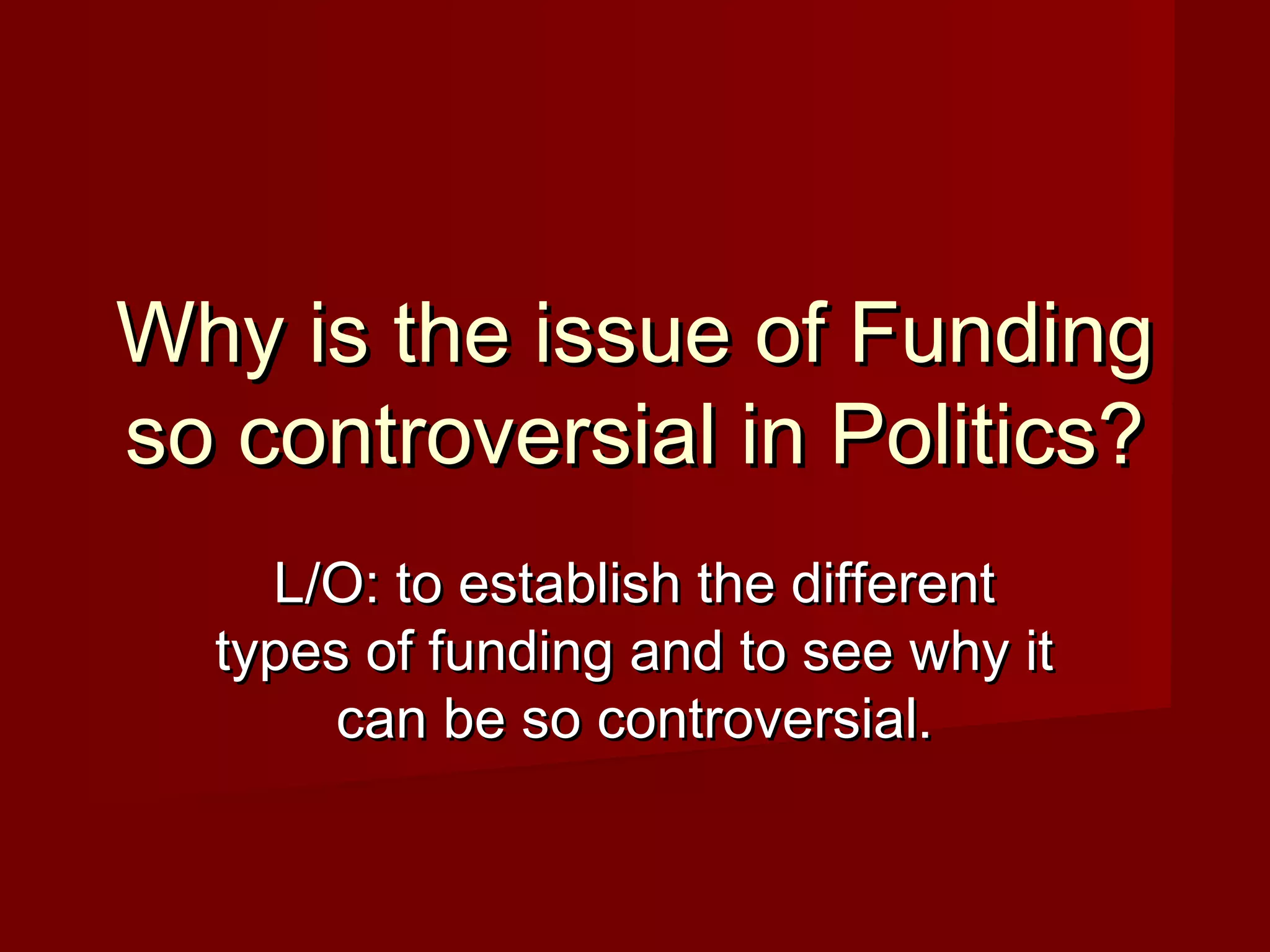 Political funding is a controversial issue because there are different types of funding sources for political parties, including membership dues, donations from wealthy individuals and corporations, and public funding. Regulations have been put in place to increase transparency around political donations due to concerns about influence over policy decisions. Labour Party membership has fallen to its lowest level in over 100 years, contributing to its large debts and precarious financial position.