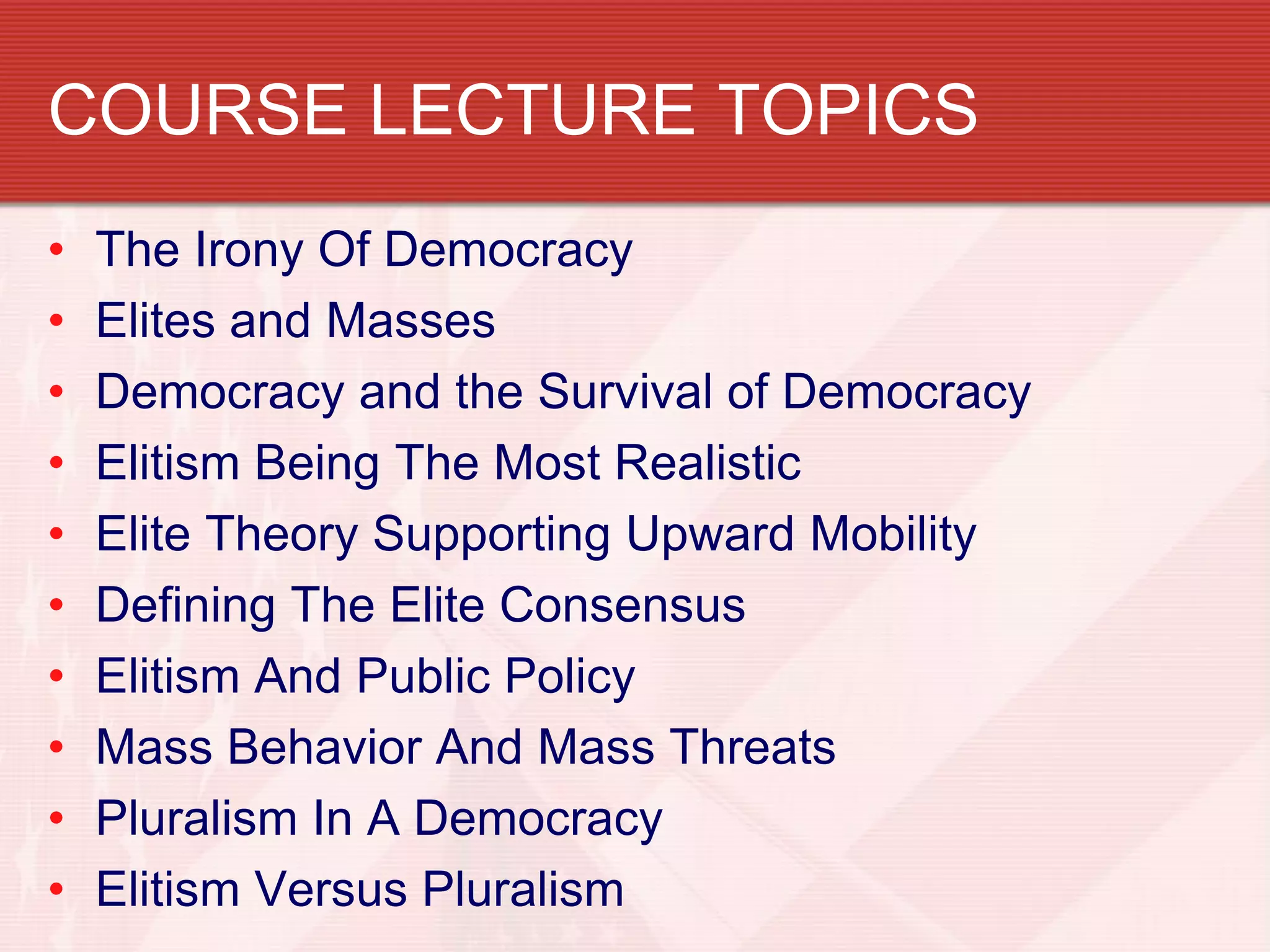 The document presents an overview of elitism and pluralism in the context of American democracy, highlighting the power dynamics between elites and the masses. It examines how elites influence public policy and mass behavior while addressing the role of pluralism in protecting minority rights through competing interests. Additionally, the document discusses the significance of propaganda, information flow, and political theory in shaping societal norms and governance.