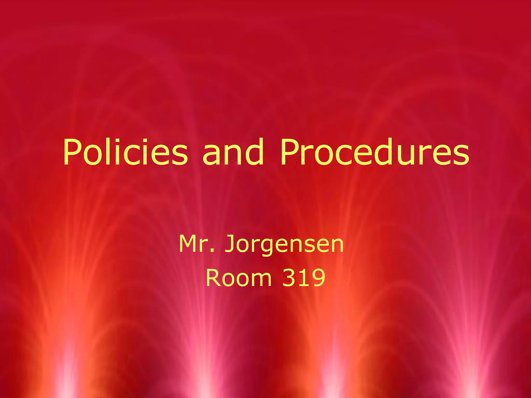 1. The document outlines classroom policies and procedures for Mr. Jorgensen's room 319 class. It details expectations for entering class on time, following directions, signing out when leaving the room, and assigned seating.