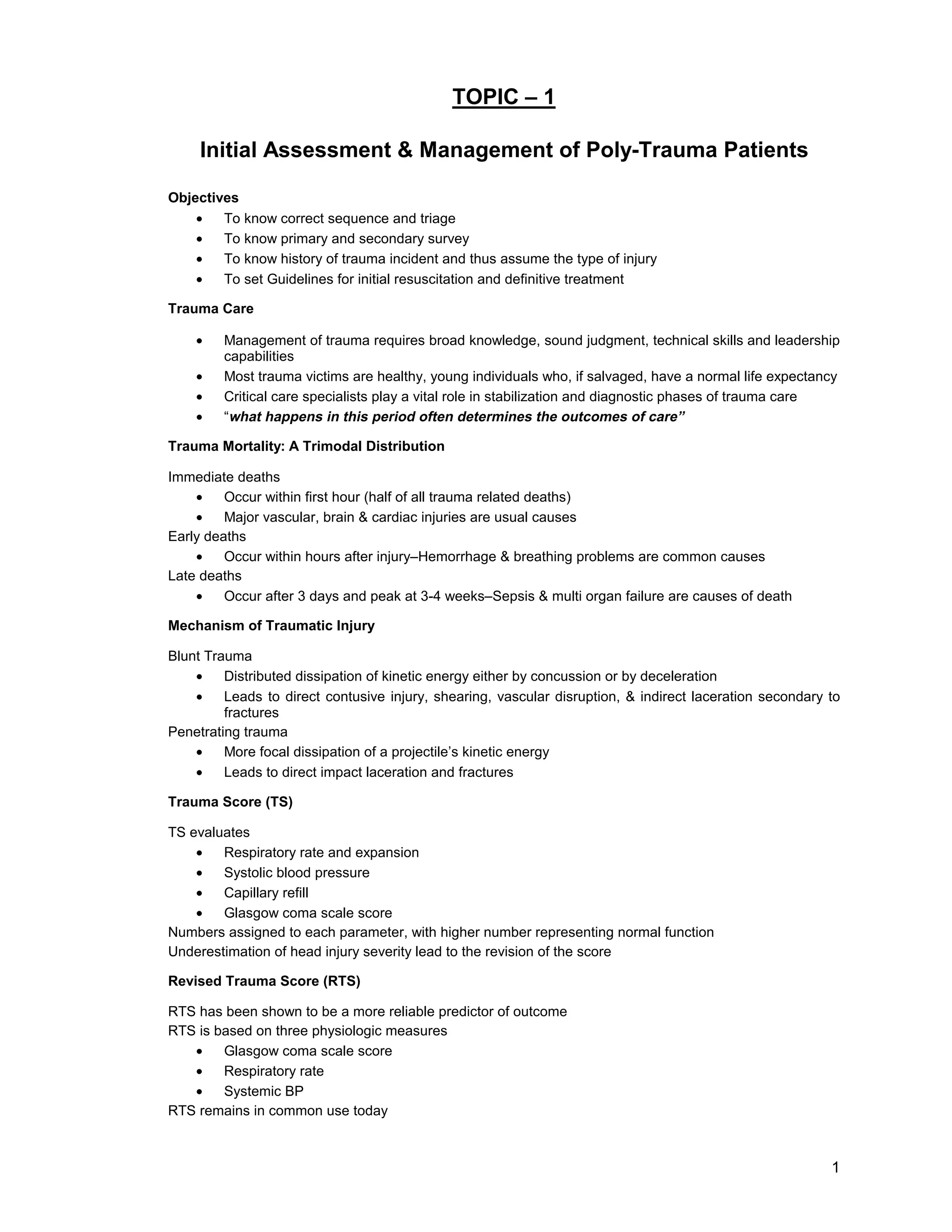 Initial management of polytrauma patients requires a systematic approach with airway, breathing, and circulation as top priorities. The primary survey assesses these areas to identify life-threatening injuries, while the secondary survey provides a full head-to-toe examination to identify all injuries and guide further treatment. Trauma mortality follows a trimodal distribution with immediate deaths from major vascular or brain injuries within an hour, early deaths from hemorrhage or respiratory failure within hours, and late deaths after 3 days often from sepsis or organ failure.