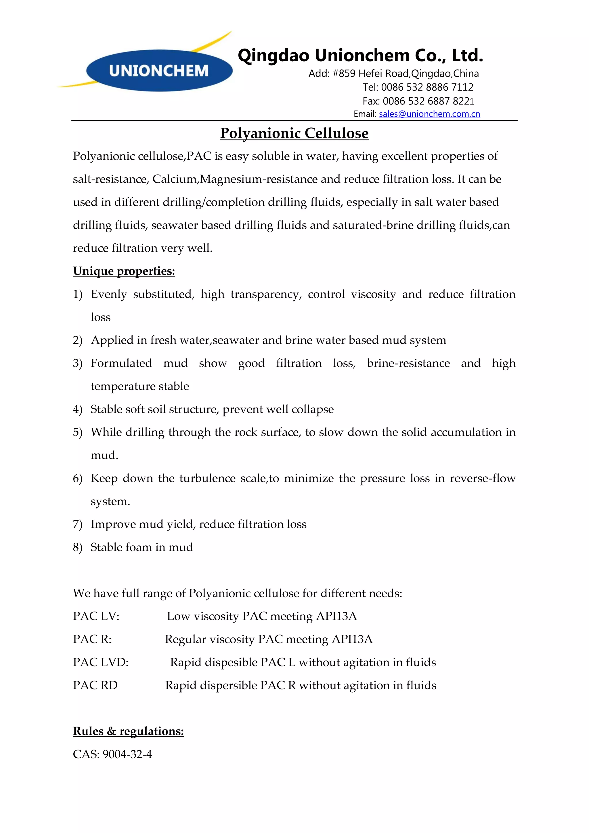 This document provides information about Polyanionic Cellulose from Qingdao Unionchem Co., Ltd. Polyanionic cellulose, or PAC, is water soluble and has excellent salt and calcium/magnesium resistance properties. It can be used in various drilling fluids, especially salt water and seawater based fluids, to reduce filtration loss. The company offers a full range of PAC products for different applications.