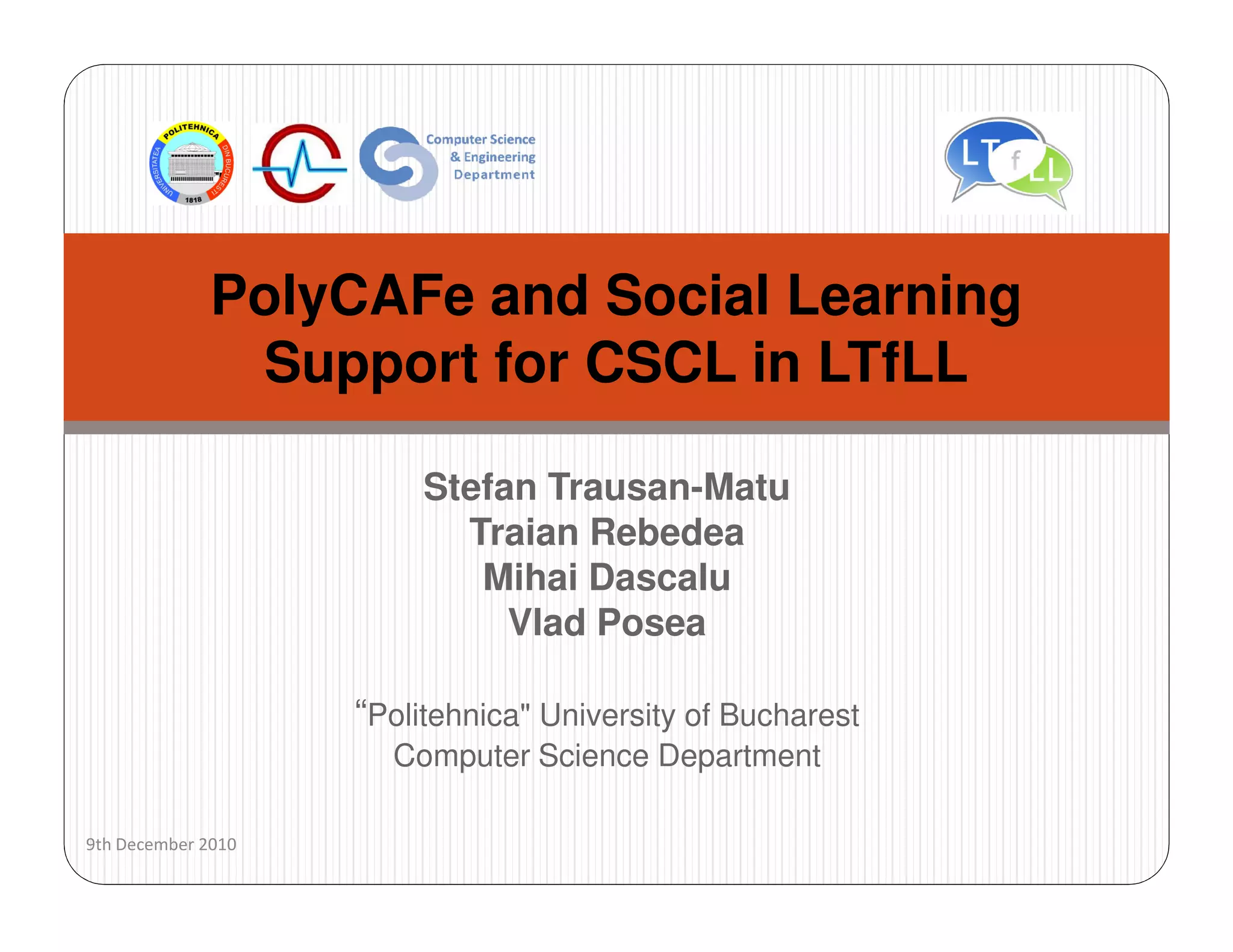 This document describes PolyCAFe, a system for analyzing collaborative learning conversations. PolyCAFe was developed as part of the LTfLL project to provide automated feedback and summaries of chat discussions. It is based on theories of collaborative learning and uses natural language processing techniques like part-of-speech tagging and semantic analysis. The system was validated through experiments with students and teachers who found that it helped reduce the time to provide feedback and improved the quality of feedback for collaborative assignments.
