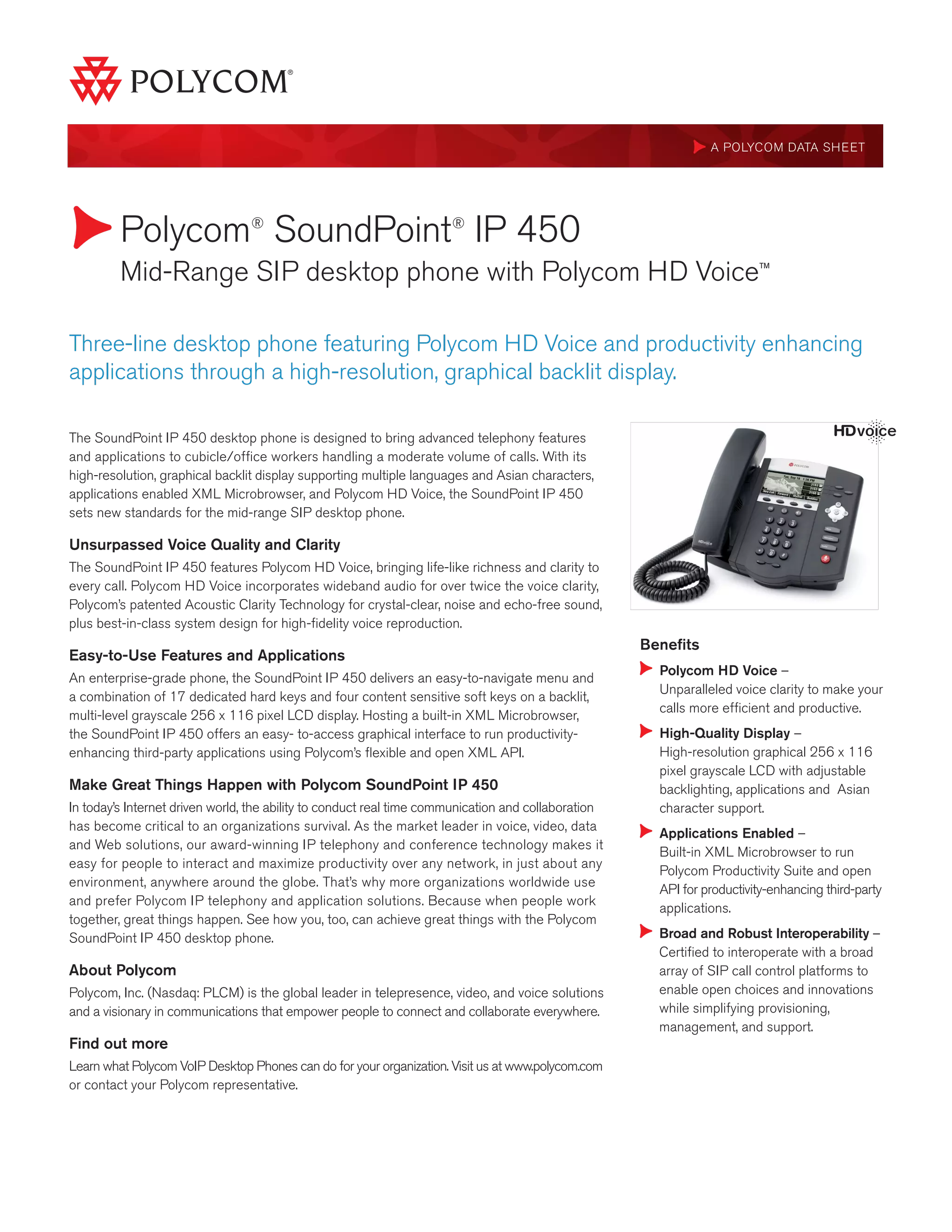 The Polycom SoundPoint IP 450 is a three-line desktop phone that features Polycom HD Voice technology for high quality audio. It has a high resolution backlit display, dedicated buttons, and support for applications through its XML microbrowser. The phone is designed for office workers handling moderate call volumes. It provides crystal clear calls, productivity applications, and interoperability with SIP platforms.
