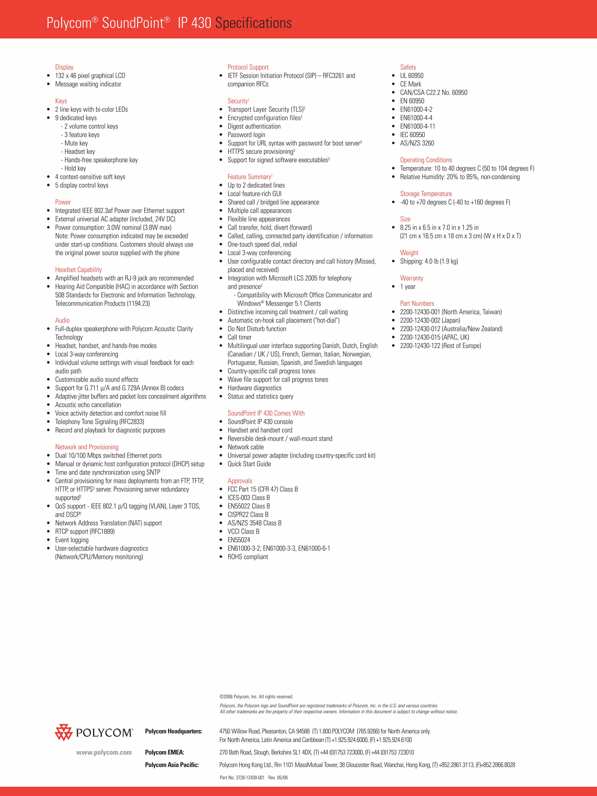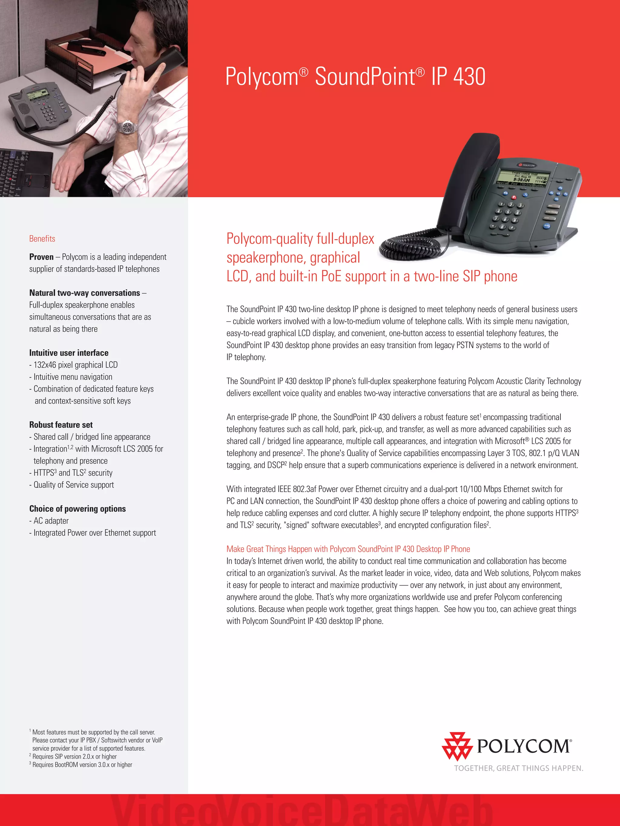 The Polycom SoundPoint IP 430 is a two-line SIP desktop phone designed for general business users. It features a full-duplex speakerphone, graphical LCD display, intuitive menu navigation, and integrated Power over Ethernet support. The phone provides a robust feature set including call hold, park, transfer, shared call appearances and Microsoft LCS 2005 integration. It offers choice in powering and cabling options to help reduce expenses and supports security measures like HTTPS and TLS.