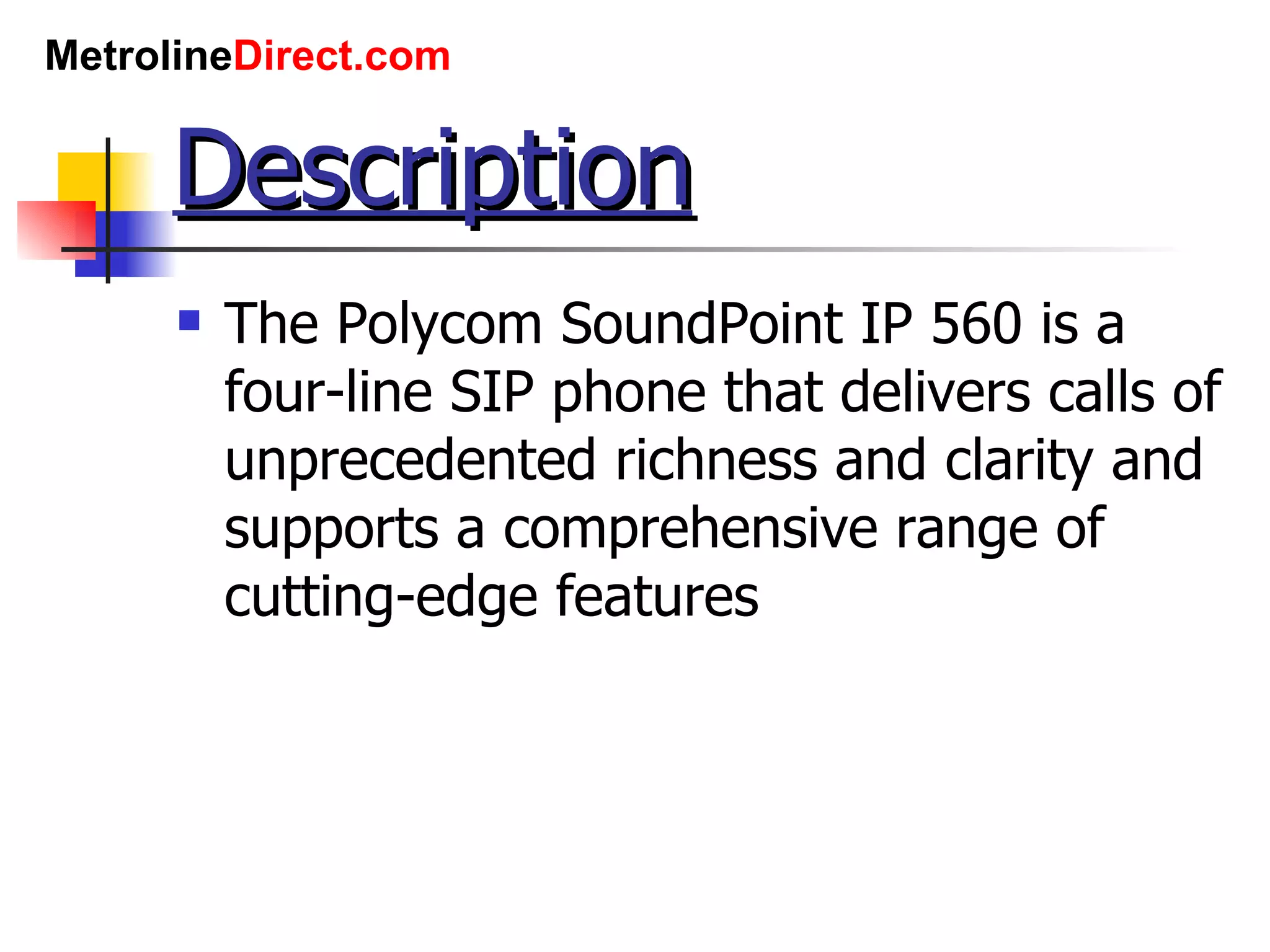 The Polycom SoundPoint IP 560 is a four-line SIP phone that delivers high quality audio calls and supports features like presence, text messaging, buddy lists, and a web browser. It has options for provisioning, power, and interoperability with leading IP PBX and softswitch platforms.