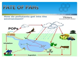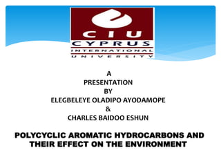 The presentation by Elegbeleye Oladipo Ayodamope and Charles Baidoo Eshun discusses polycyclic aromatic hydrocarbons (PAHs), their environmental effects, sources, degradation processes, and remediation strategies. PAHs, primarily produced from incomplete combustion of organic matter, are toxic and persistent in the environment, with potential risks to human and ecological health. The document emphasizes the importance of understanding PAH pollution while recognizing their utility in producing various products.